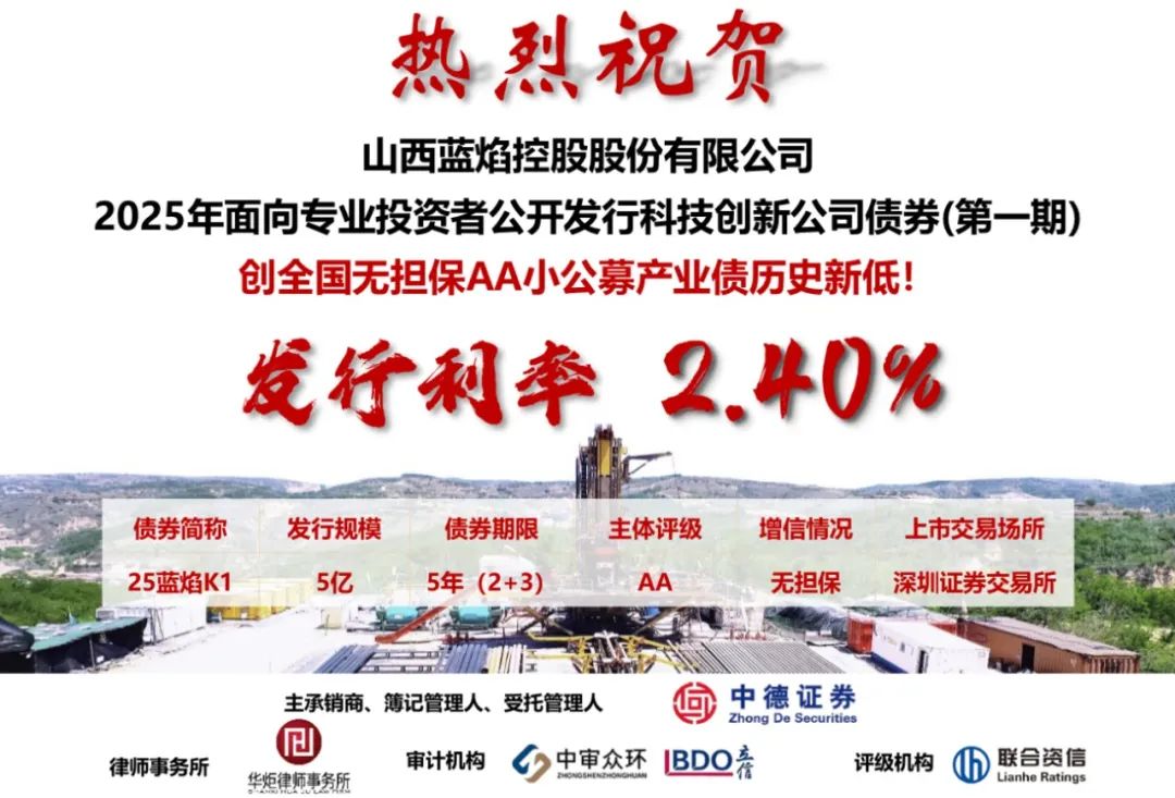 中德证券作为独家主承销商成功完成了山西蓝焰控股股份有限公司2025年面向专业投资者公开发行科技创新公司债券(第一期)的发行工作。本期债券发行规模为5亿元,债券期限为2+3年期,票面利率为2.40%,创全国无担保AA小公募产业债历史新低。