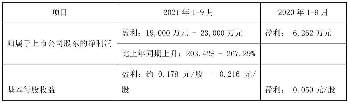 挖贝网10月14日,中科三环(000970)近日发布2021年前三季度业绩预告公告,预计2021年前三季度实现归属于上市公司股东的净利润为19000万元–23000万元,比上年同期增加203.42%–267.29%。