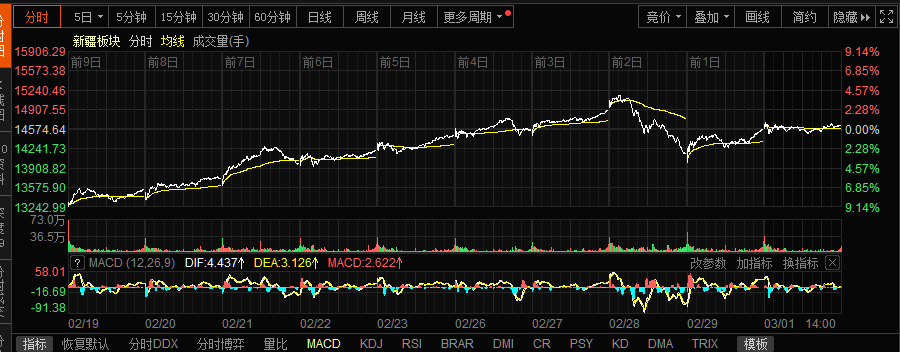 天山网-新疆日报讯(记者王永飞报道)3月1日收盘时,新疆板块指数14641.64,涨幅0.46%;当日34只股票上涨,22只股票下跌,4只股票平盘,上涨率56.67%;当日总换手率1.27%,总成交额79.61亿元。