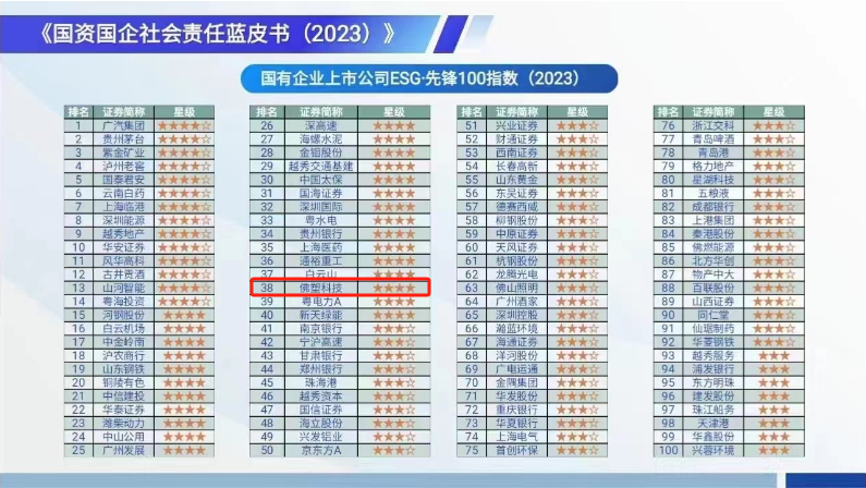 佛塑科技凭借在国有企业上市公司ESG管理工作中的突出成绩,成功入选“国有企业上市公司ESG·先锋100指数”,位列第38名。此前佛塑科技已成功入选2023年上市公司ESG优秀实践案例、大湾区国企ESG发展指数,获评2023年度“责任犇牛奖·ESG新秀企业”,此次上榜也进一步证明了佛塑科技ESG工作实践及信息披露做法获得充分认可。