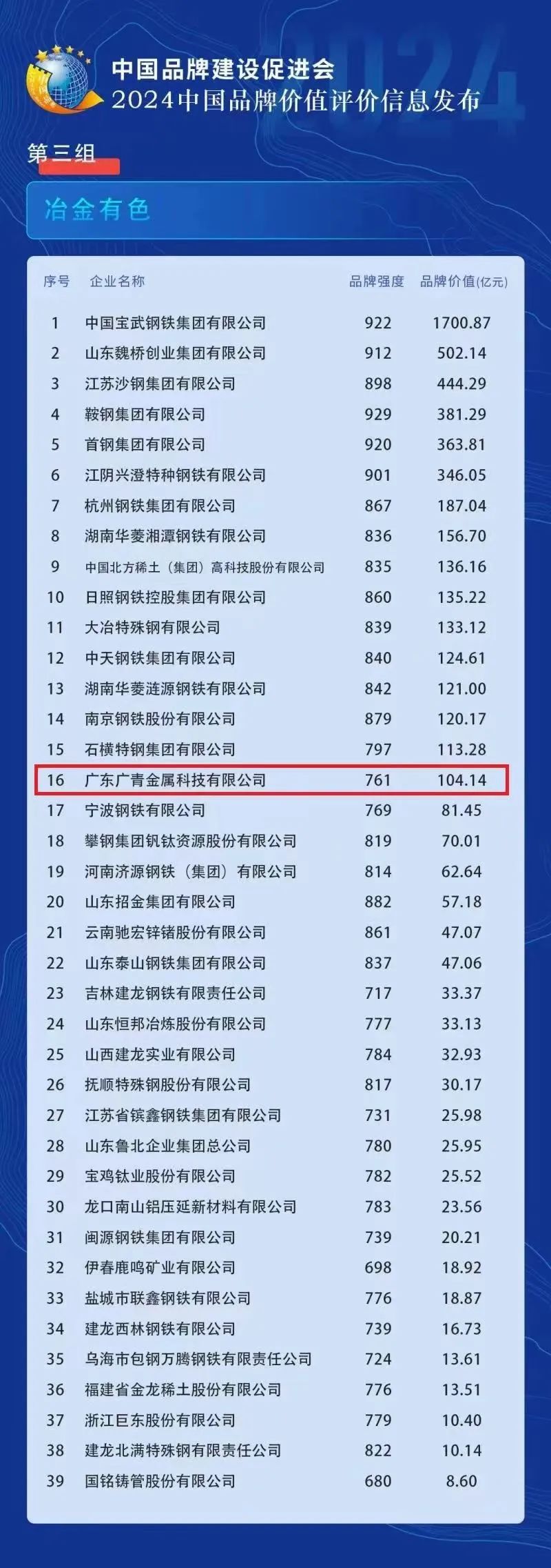 在“2024中国品牌价值评价信息”中,广青科技以104.14亿元的品牌价值成功上榜,是冶金有色领域唯一上榜的广东品牌,位列全国第16位。
