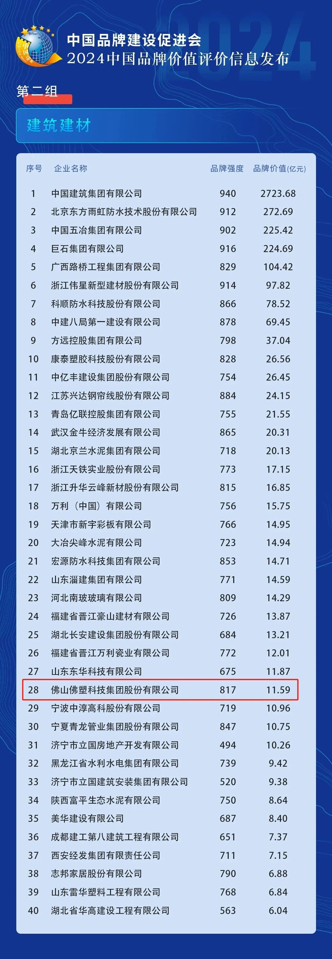 在“2024中国品牌价值评价信息”中,佛塑科技以11.59亿元的品牌价值成功上榜,在建筑建材领域位列全国第28位。
