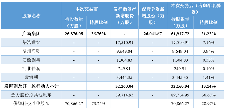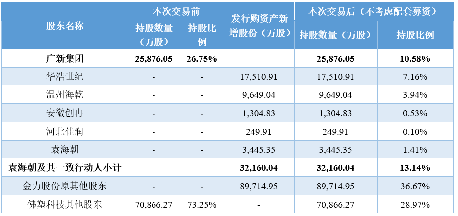 本次交易前广新集团持股26.75%,停牌前佛塑科技总市值约55亿元,而本次交易金力股份定价50.8亿元,金力股份原实际控制人袁海朝及其一致行动人持有25.85%金力股份。