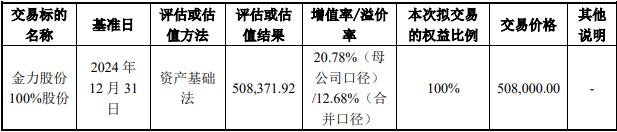 根据 中联评估 以2024年12月31日为评估基准日出具的《资产评估报告》,截至评估基准日,标的公司股东全部权益价值的评估值为508,371.92万元,较母公司口径账面价值420,892.47万元增值87,479.45万元,母公司口径账面所有者权益评估增值率为20.78%,合并口径(归属于母公司)账面所有者权益评估增值率为12.68%。交易各方根据上述评估结果经友好协商后确认,在本次交易中标的资产的交易作价为人民币508,000.00万元。其中,40,000万元以现金对价的方式支付,468,000万元以发行股份的方式支付。