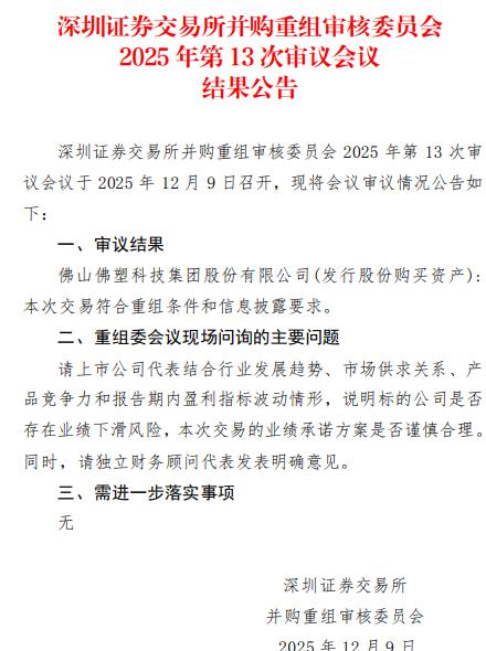 中国经济网北京12月10日讯深交所并购重组审核委员会2025年第13次审议会议于昨日召开,会议审议结果显示,佛山 佛塑科技 集团股份有限公司( 佛塑科技 ,000973.SZ)发行股份购买资产符合重组条件和信息披露要求。