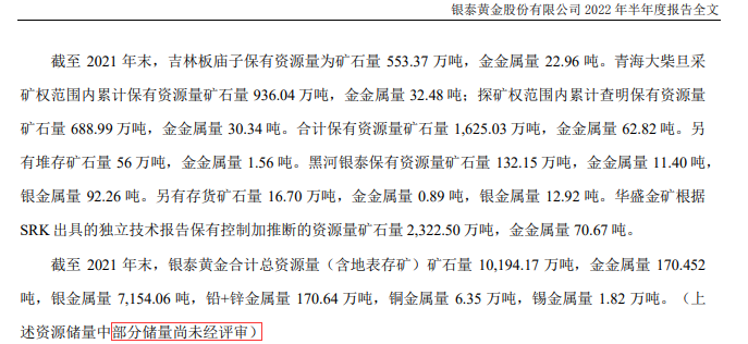 值得注意的是,在银泰黄金的半年报中,还表明部分储量未经评审,由于开采条件、开采成本等因素的限制,因此存在公告中所列出的储量较实际可开采储量偏多的可能。