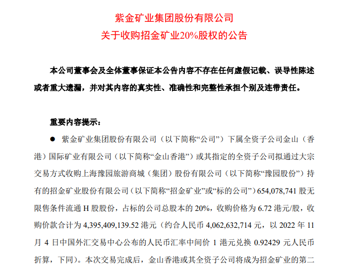 巧合的是,就在11月7日,同为黄金行业头部企业的紫金矿业宣布,收购港股招金矿业20%股权,收购价为6.72港元每股。