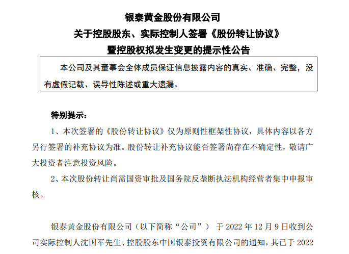 12月12日,银泰黄金公告称,公司控股股东、实际控制人沈国军先生及中国银泰投资有限公司于2022年12月9日与山东黄金矿业股份有限公司(以下简称“山东黄金”)签署了《股份转让协议》,沈国军先生及中国银泰投资有限公司拟将其合计持有公司20.93%的股份转让给山东黄金。若本次转让全部顺利实施完成,山东黄金将成为公司控股股东,公司实际控制人将变更为山东省人民政府国有资产监督管理委员会。