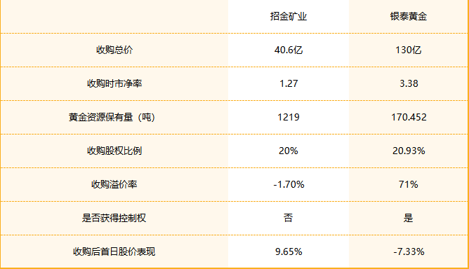 从表中数据可以看出,紫金矿业收购招金矿业是折价收购,虽然银泰黄金还有7154.06吨银矿等其他资源,但招金矿业在黄金保有量、市净率等数据方面都远好于银泰黄金。