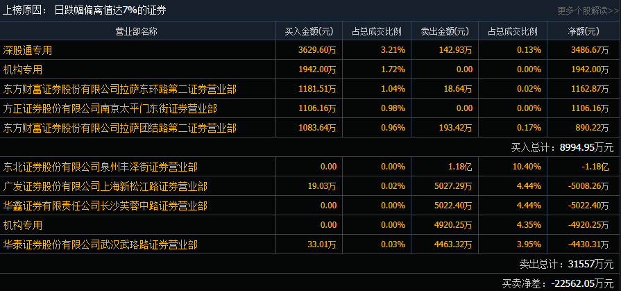 浪潮信息(000977)一字跌停,成交额11.31亿元,换手率1.99%。盘后龙虎榜数据显示,深股通专用席位买入3629.60万元并卖出142.93万元,1家机构专用席位净买入1942.00万元,1家机构专用席位净卖出4920.25万元,东北证券泉州丰泽街净卖出1.18亿元。
