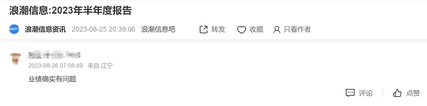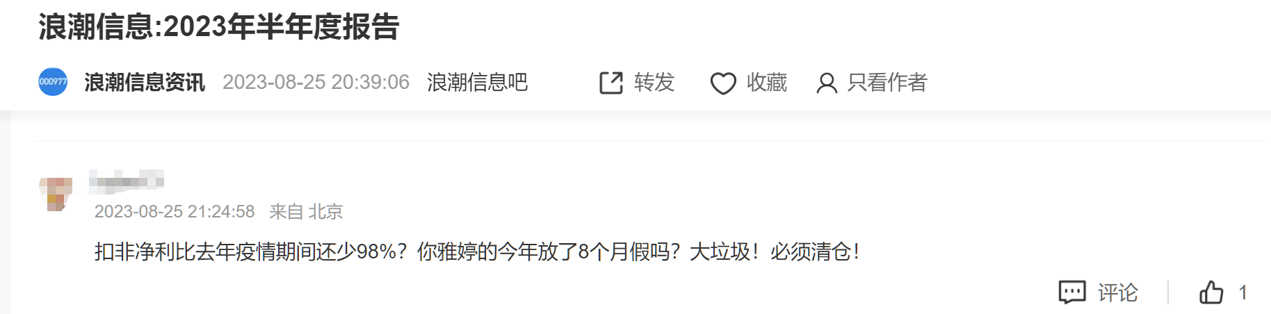 下滑的业绩也引发了投资者的关注。“扣非净利比去年疫情期间还少98%?”“业绩确实有问题。”时代周报记者注意到,在股吧有网友发帖吐槽道。