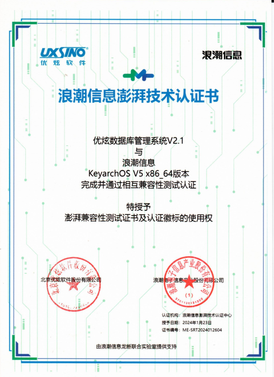 日前,优炫数据库(简称UXDB)与KeyarchOS完成浪潮信息澎湃技术认证,经双方测试,产品可以共同运行,整体系统稳定,产品体验良好,可满足用户安全性、可靠性及关键性应用需求。