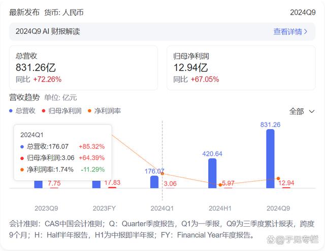 据浪潮信息发布的2024年三季报,截至本报告期末,公司营业总收入831.26亿元,同比上升72.26%,归母净利润12.94亿元,同比上升67.05%。