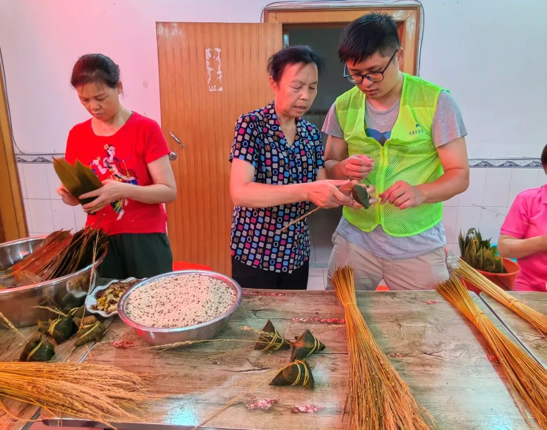 活动现场,粽叶、糯米、绿豆、芝麻、板栗、猪肉等材料整齐摆放在桌子上。“把粽叶重叠,再卷成一个漏斗形状,再舀上一些糯米,放上芝麻、猪肉、板栗,再填上糯米,长出来的粽叶覆盖开口…”社区阿姨们正在耐心的教大家如何包粽子,大家热情高涨,一边虚心请教一边动手尝试,在欢声笑语中形状各异的粽子就堆满了桌子。