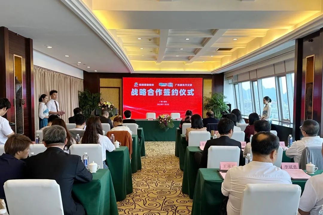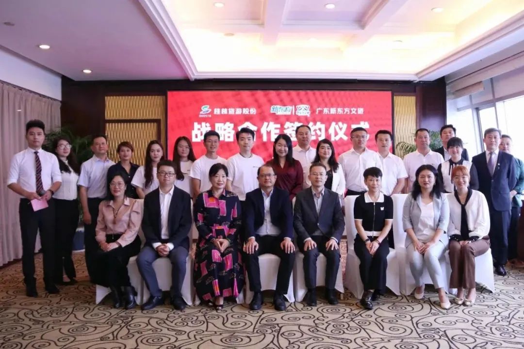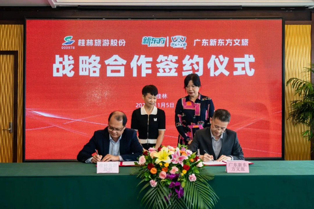 11月5日,桂林旅游股份有限公司(以下简称“桂林旅股公司”)与广东新东方文旅战略合作签约仪式在漓江大瀑布饭店圆满举行。桂林旅股公司党委委员、董事、副总裁訚林、公司党委委员、董事、副总裁郑宁丽,新东方教育科技集团有限公司副总裁孙进出席签约仪式并进行签约。桂林市文化广电和旅游局三级调研员张志红、秀峰区政府二级调研员陈昭出席并见证签约。