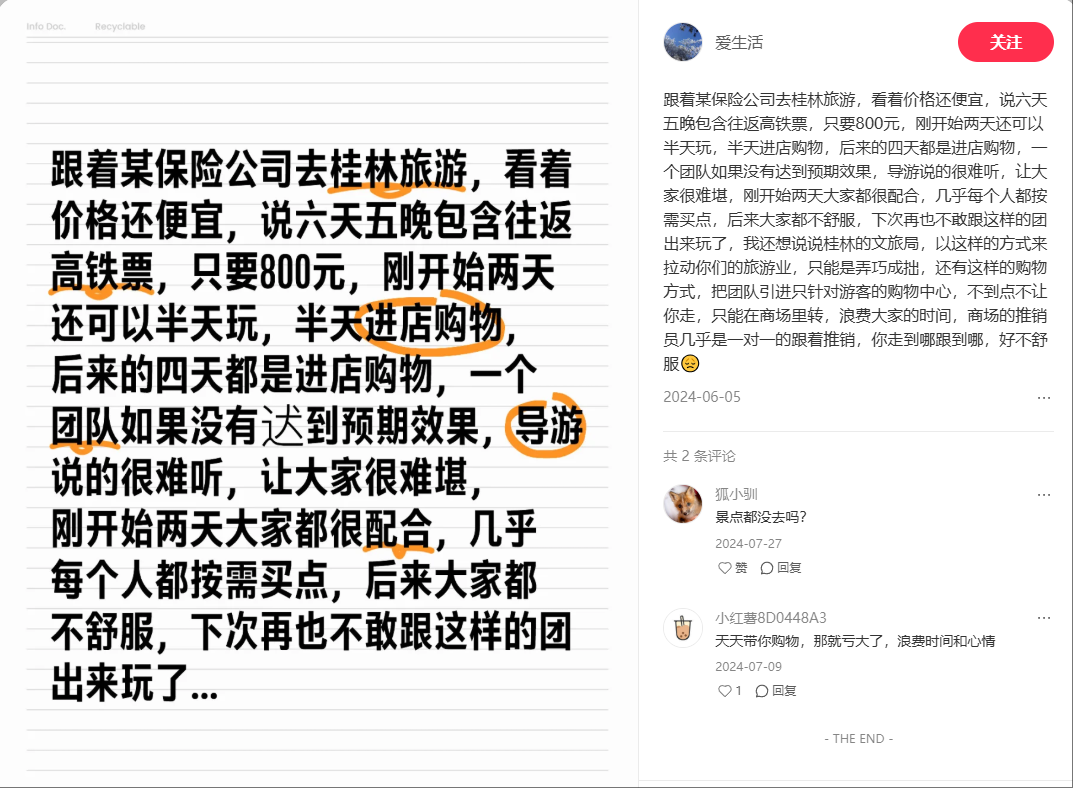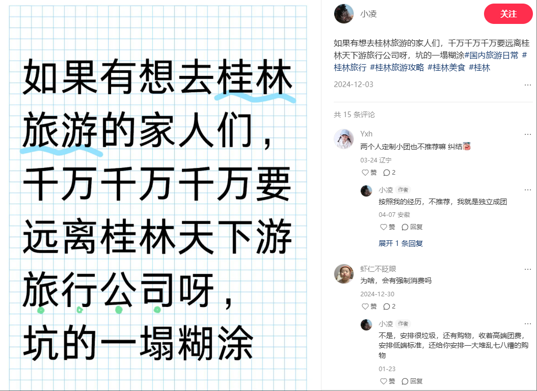 另一个小红书帖子也在投诉桂林旅游的旅游公司:
