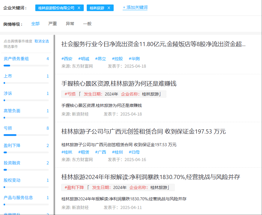 根据AI风险控制系统“RiskRaider风险雷达”观察桂林旅游公司的风险状况,部分截图如下:
