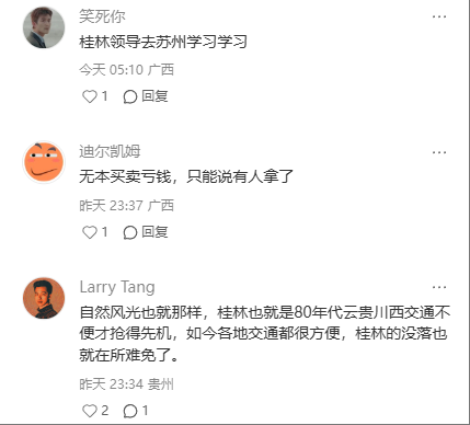 比较其他区域的旅游体验,桂林旅游的体验相对原始,更多的粗劣的商业化,伤害旅游的体验,缺乏深度的游玩体验。游船属于玩乐的部分,数据面上更好,和游客实际需求相符。