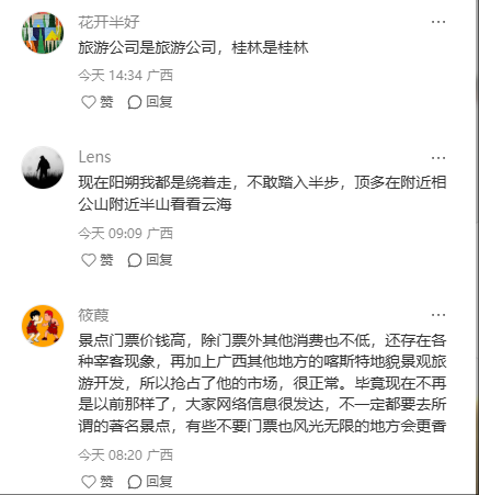 在小红书平台上,有不少曝光贴,用户“凡凡子”吐槽,在阳朔打车,打表130元的车程,上车便被要价250元。她还提到,在阳朔景点荷花池拍照需支付5元费用,否则禁止拍摄;前往月亮山这一免费景点,短短路程被拦截四次,有人以40元价格声称可带路进入,当拒绝付费后便遭其背后辱骂。帖子还提及,在阳朔20元人民币背景图取景地“黄布倒影”,优质拍照位置被人霸占,拍照需支付20元费用。用户“潇雅小朋友”也发文称,在桂林阳朔,从遇龙河打车前往兴坪古镇,连续询问三辆车,司机直接喊价150—200元才愿意接单;遇龙河竹筏漂流存在索要小费现象,船夫收到小费后服务态度明显改善。该用户还发出了“阳朔,除了风景是真的,其他都是假的”的感慨。