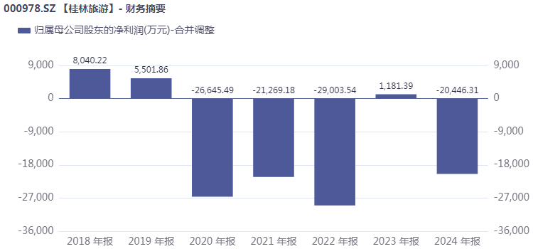 虽然拥有顶级资源,然而业绩上看, 桂林旅游 上市后表现不佳,并没有将山水资源优势转化为业绩。2020年至2024年,公司有4个年度出现亏损,亏损总额达到9.73亿元。