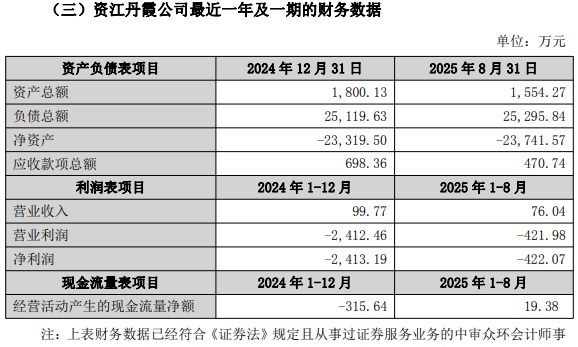 财务数据显示,今年前8个月,资江丹霞公司营收76.04万元,净利润为-422.07万元。