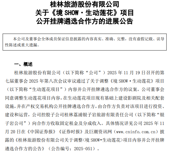 就在12月10日,公司公告,银子岩公司于2025年11月24日至12月5日在 北部湾产权交易所 公开挂牌遴选合作方,挂牌起始价格为420万元/年。12月9日,银子岩公司收到 北部湾产权交易所 发来的《电子竞价成交确认书》,截至竞价结束,征集到1家合格意向竞买方,竞买人为 桂林通鑫旅游服务有限公司 ,成交价420万元/年。同日,银子岩公司与 桂林通鑫旅游服务有限公司 签署了《桂林市荔浦银子岩景区生动莲花影剧院项目合作协议》,合作期限为九年半。