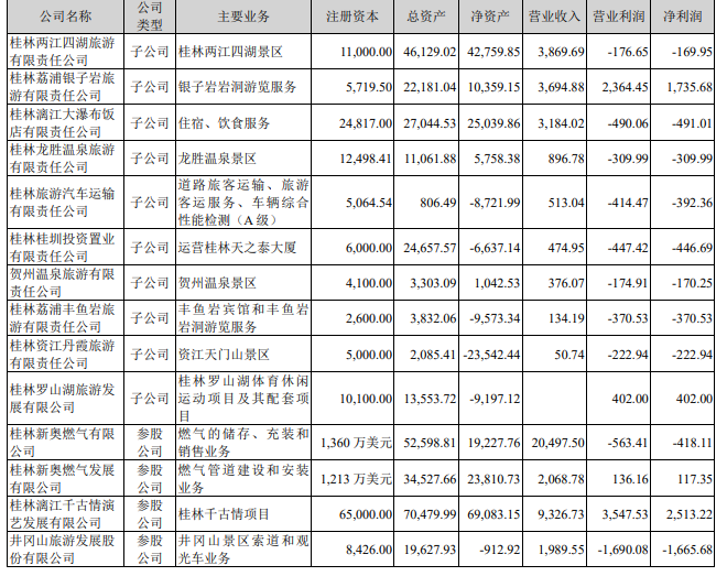 风口财经注意到,资江丹霞公司的困境并不是孤立的, 桂林旅游 多个子公司的经营情况也不乐观。根据公司今年半年报披露,至少有十家子公司和参股公司的净利润处于亏损状态。