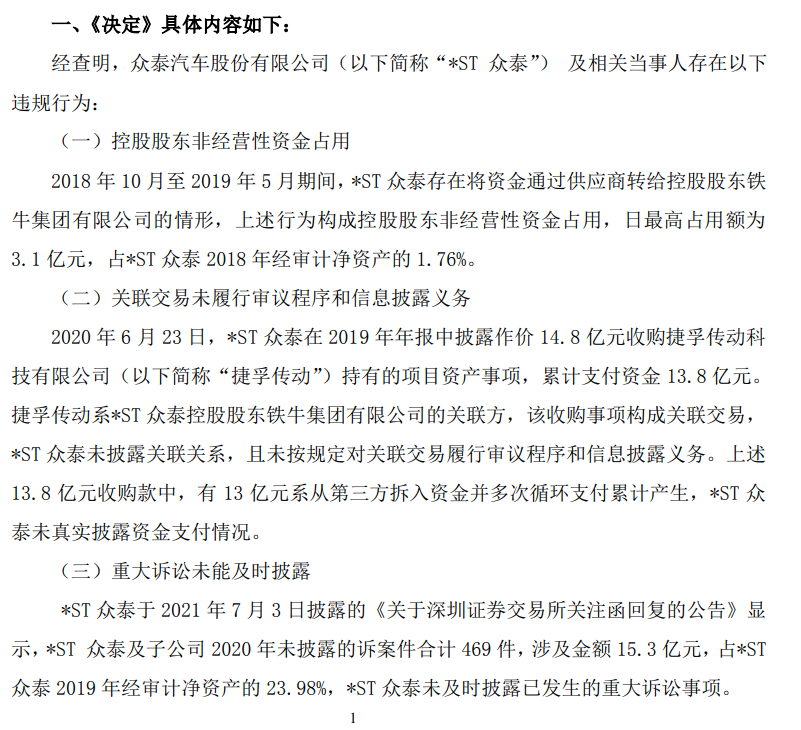 2021年9月8日,*ST众泰收到深圳证券交易所送达的《关于对众泰汽车股份有限公司及相关当事人给予纪律处分的决定》(深证上〔2021〕894 号)(以下简称“决定”),共涉及违规占款、关联交易未履行审议程序和信息披露义务、重大诉讼未能及时披露等三方面。