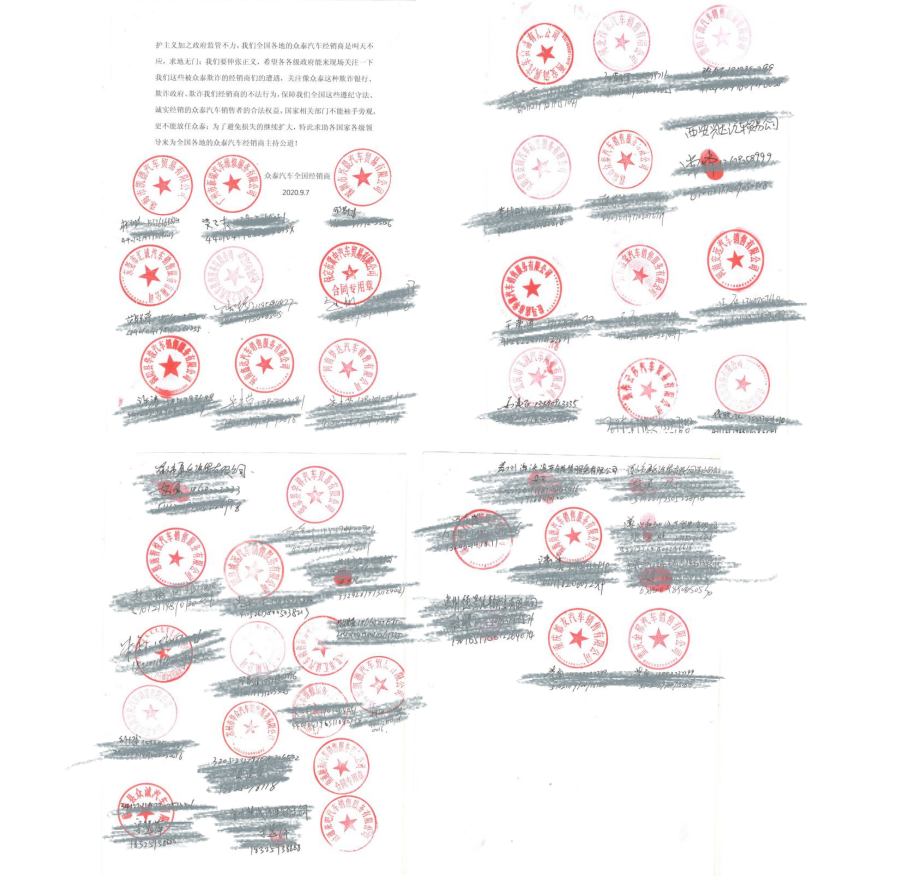 “我们的钱是通过非正常经营手段被骗去的。众泰汽销通过一个T300小强版来骗取我们钱,说谁打钱多,谁打钱快,车子先给谁,结果都打钱过去,甚至有的经销商还给他做三方,银行担保,结果大部分一辆车都没拿到,小部分拿了几辆。现在全国几十万辆车都没有质保,客户投诉当地主管部门也是束手无策。去年政府担保给众泰贷款三十个亿,明确复工复产用的,最后钱没了,一辆车都没产。全国各地众泰客户买了车在保修期内无法质保已违反国家三包法!”梁勇直言。