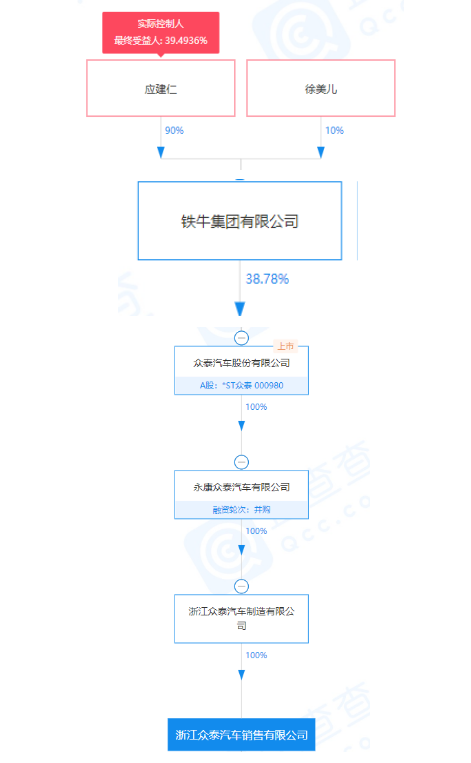 企查查显示,永康法院已裁定浙江众泰汽车销售有限公司(以下简称“众泰汽销”)破产清算,企查查股权穿透图显示,众泰汽销为永康众泰汽车有限公司全资子公司浙江众泰汽车制造有限公司旗下100%控股的子公司,而永康众泰汽车有限公司的母公司则为上市公司*ST众泰。上市公司*ST众泰,控股方为铁牛集团,其中应建仁为铁牛集团董事长、经理,徐美儿为铁牛集团董事,金浙勇不仅是铁牛控股的*ST众泰时任董事长,同时是浙江众泰汽车销售有限公司的法定代表人和执行董事。