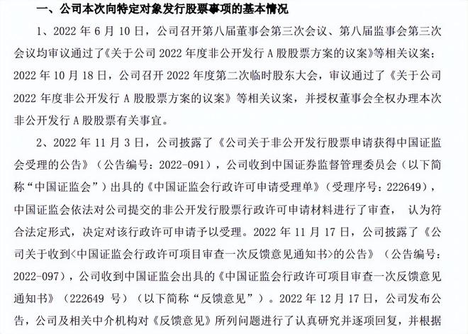 1)事情要回到2022年6月10日,当时该司审议通过了《关于公司2022年度非公开发行A股股票方案的议案》等相关议案;