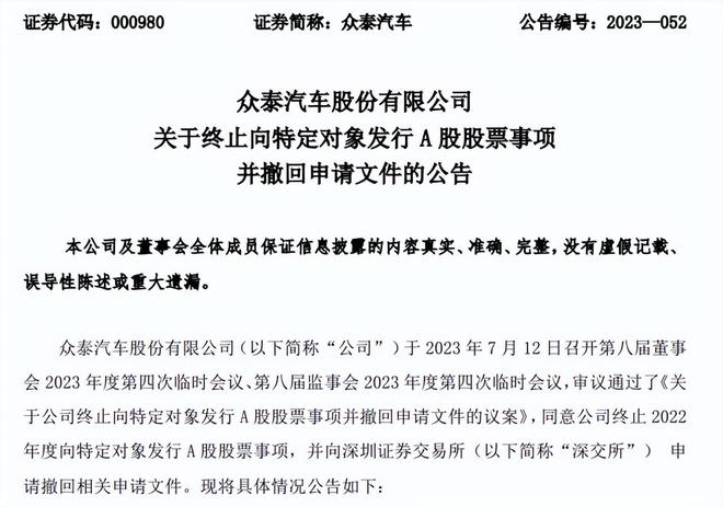 2023年7月12日,众泰汽车召开了该司第八届董事会2023年度第四次临时会议、第八届监事会2023年度第四次临时会议,审议通过了《关于公司终止向特定对象发行A股股票事项并撤回申请文件的议案》,并向深交所申请撤回相关申请文件。
