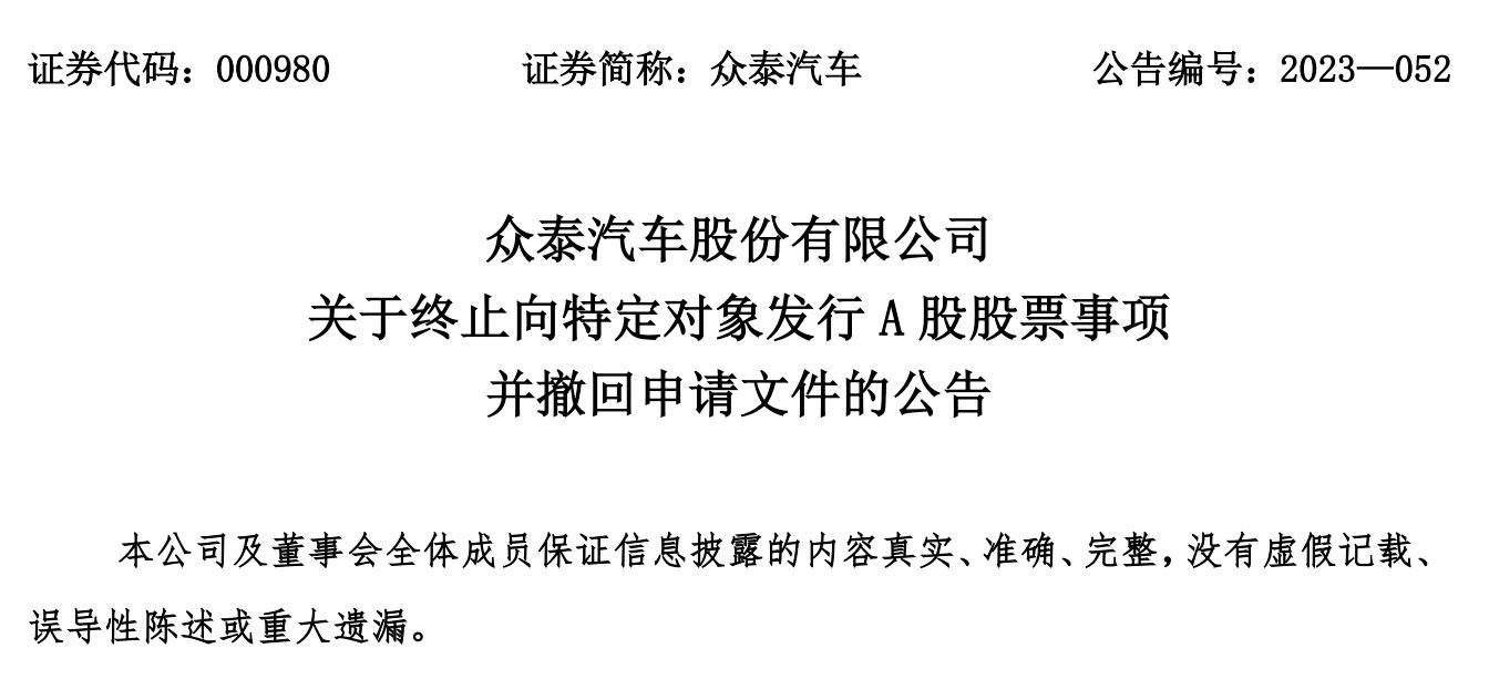 7月12日晚,众泰汽车发布公告称,公司决定终止向特定对象发行股票事项并撤回相关申请文件。官方并没有给出具体的原因,只是表示,在综合考虑外部市场环境变化、公司实际情况、控股股东及实控人筹划变更公司实控人等诸多因素后,决定终止本次定增。