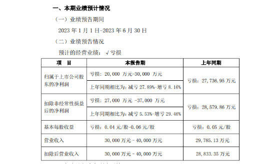 7月14日,众泰汽车发布2023半年度业绩预告显示,公司上半年营业收入达3亿元至4亿元,上年同期为2.98亿元;净利润为-2亿元至-3亿元,上年同期为-2.77亿元;扣非净利润为-2.7亿元至-3.7亿元,上年同期为-2.86亿元。