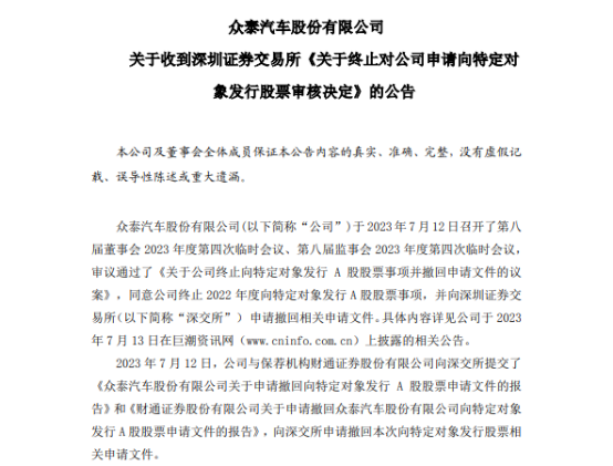 7月15日,众泰汽车公告称,根据有关规定,深交所决定终止对公司申请向特定对象发行股票的审核。