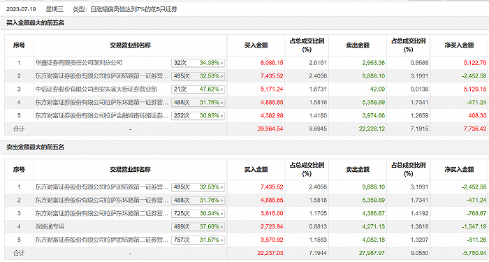 众泰汽车7月19日涨停,龙虎榜数据显示,上榜营业部席位全天成交7.48亿元,占当日总成交金额比例为24.22%。其中,买入金额为3.99亿元,卖出金额为3.5亿元,合计净买入4909.3万元。