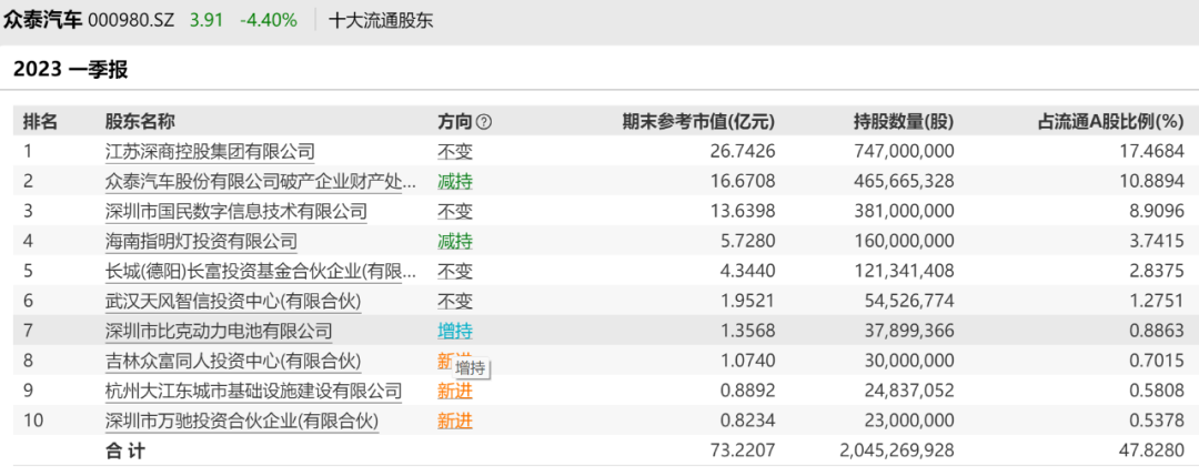 众泰汽车第一大股东持流通股17%