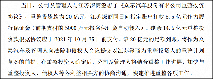 根据公告来看,2021年9月,众泰汽车与江苏深商签署重整协议,后者将投资20亿元,成为众泰控股股东,黄继宏(江苏深商总裁)成为众泰实控人,帮助众泰汽车重整。