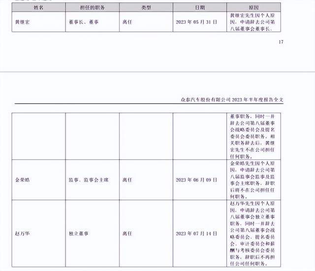 今年5月31日,黄继宏因个人原因,申请辞去众泰汽车第八届董事会董事长、董事职务,同时一并辞去公司第八届董事会战略委员会及提名委员会委员职务。相关职务辞去后,黄继宏不在公司担任任何职务。