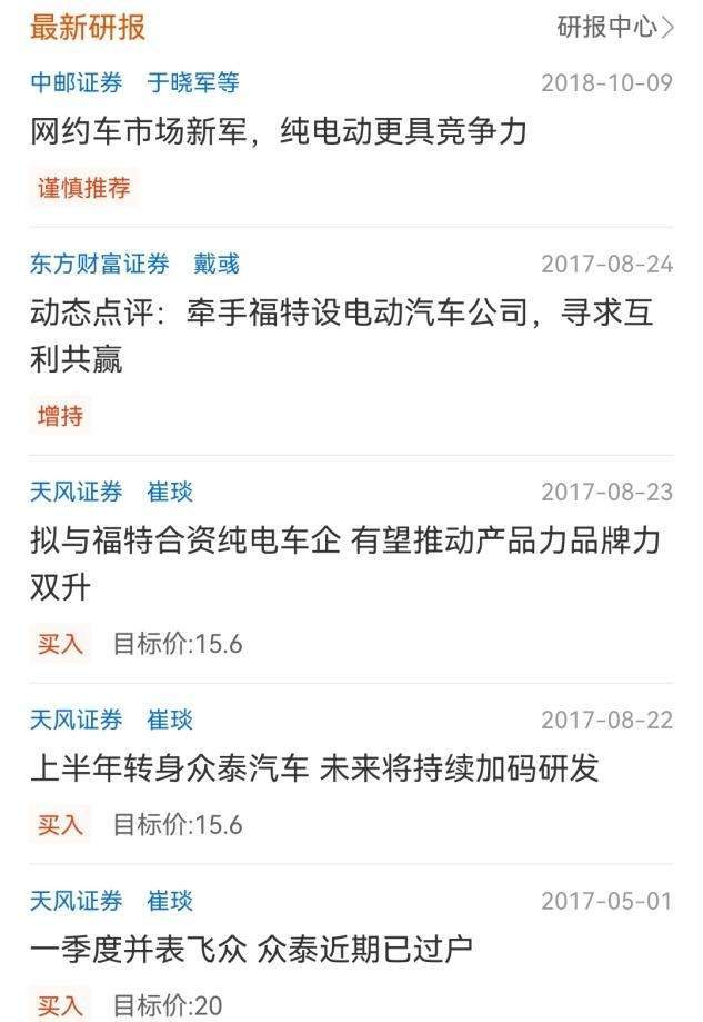 值得一提的是,据证券软件显示,券商分析师给众泰汽车最后一篇研报的时间停留在2018年10月9日。也就是说,从2018年11月份至今,众泰汽车很少受到券商分析师关注。