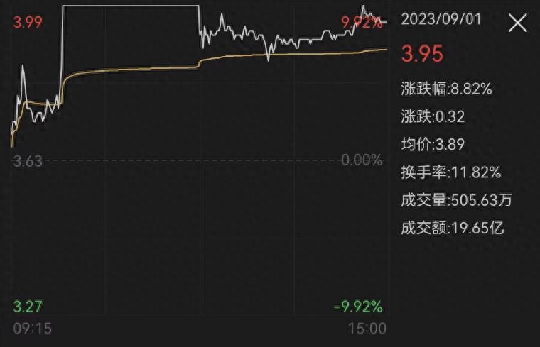 9月1日,众泰汽车股价开盘后不久便快速拉升至涨停,截止当日收盘,公司股价上涨8.82%,报3.95元/股。