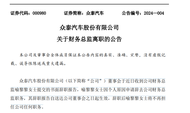 2024年2月1日,众泰汽车发布公告,公司董事会于近日收到公司财务总监喻黎黎提交的书面辞职报告,喻黎黎因个人原因申请辞去公司财务总监职务,其辞职报告自送达公司董事会之日起生效,辞职后喻黎黎将不再担任公司任何职务。