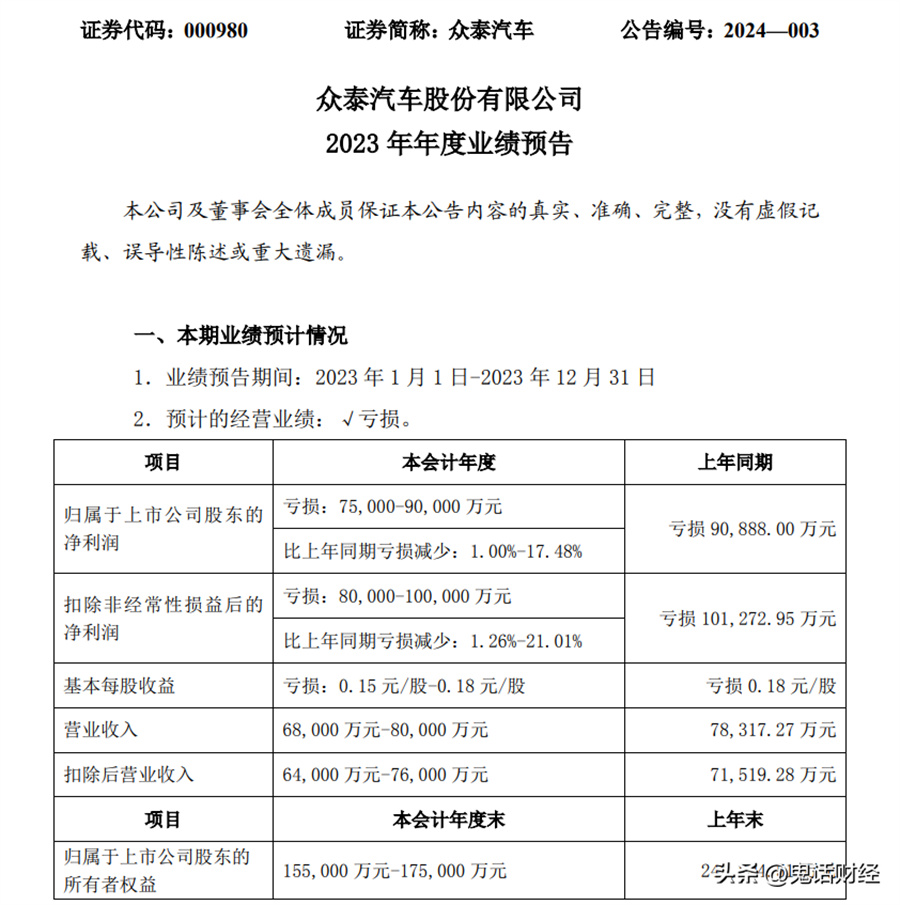 1月底众泰汽车发布了2023年业绩预告,2023年将会亏损7.5亿元-9亿元,扣除非经常性损益后亏损8亿元-10亿元。由于2019年至2022年,众泰汽车净利润分别为-111.9亿元、-103.43亿元、-7.06亿元和-9.09亿元。再加上2023年这一笔亏损,公司已经是连续亏损5年。公告中公司表示:2023年度公司整车业务仍在恢复中,销量规模较小。公司拟计提资产减值准备和坏账准备等合计约3亿元至4亿元,因此整体业绩仍处于亏损状态。
