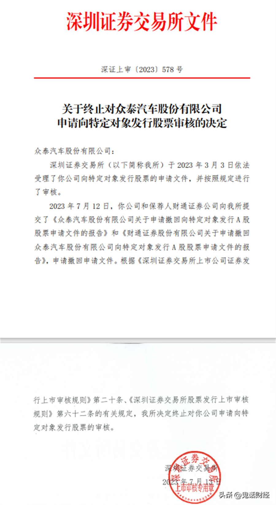 只是很快事情发生了变化,股价一波又一波的下跌,成交量也在两波下跌过程中持续出现了放大。为什么呢?仍然还是从公告中可以找到原因,从2022年6月开始发布非公开发行的预告市场就开始炒作,但是交易所始终没有放行公司的定增预案,而是不断发出审核问询函。在双方拉锯了一年之后,2023年7月众泰终于撤回了非公开发行股票的申请,深交所这一次反应很快,立即发布了终止众泰定增的决定书。