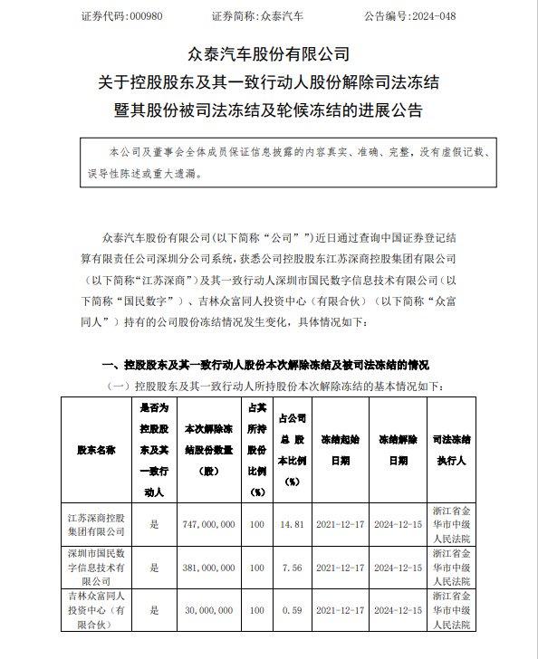 12 月 15 日,上述股东所持众泰汽车股份均解除司法冻结。其中,江苏深商控股集团有限公司解除冻结 7.47 亿股,占其持股比例 100%,对应公司总股本 14.81%;深圳市国民数字信息技术有限公司解除 3.81 亿股,占其持股 100%,占总股本 7.56%;吉林众富同人投资中心(有限合伙)解除 3000 万股,占其持股 100%,占总股本 0.59%,解冻执行法院为浙江省金华市中级人民法院。