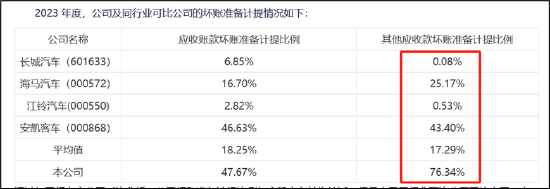 进一步对比同行发现,同期行业应收账款坏账计提比例均值为18.25%,而众泰汽车高达47.67%;同期其他应收款坏账计提比例行业均值为17.29%,而公司高达76.34%。