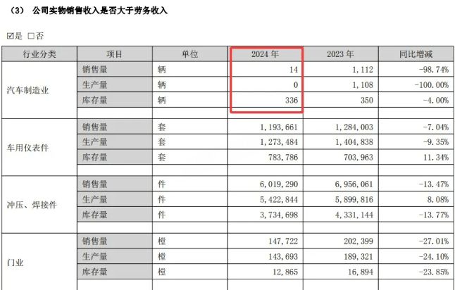 据悉,众泰汽车2024年营业收入主要来源于汽车配件和门业的销售。财报显示,2024年众泰汽车销量仅14辆,较2023年销售的1112辆减少了98.74%。生产方面,众泰汽车2024年生产量为0辆,而2023年产量为1108辆;2024年库存量为336辆,较2023年的350辆下降了4%。
