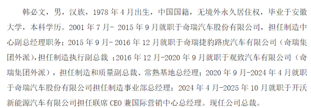 11月28日, 众泰汽车 公告聘任韩必文为公司总裁。履历显示,韩必文先后就职于 奇瑞汽车 (09973.HK)、 奇瑞捷豹路虎汽车有限公司 ,有数十年的奇瑞系任职经历。离开奇瑞系后,韩必文2024年4月至2025年10月在开沃新能源汽车有限公司担任联席CEO兼国际营销中心总经理,直至此次履新 众泰汽车 总裁一职。