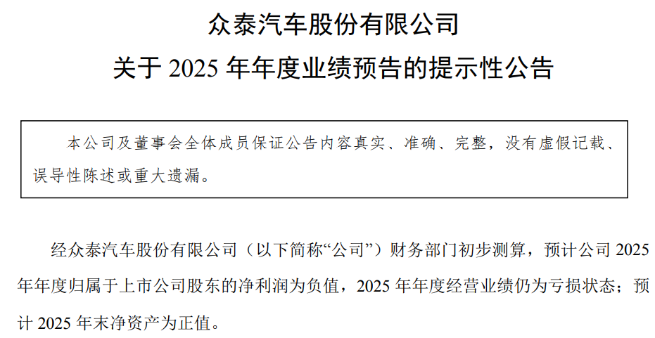 就在获得贷款前,众泰汽车完成了高层换血。1月15日,公司选举“70后”韩必文为第九届董事会董事长。韩必文出生于1978年,曾在奇瑞汽车工作20多年。2025年11月28日被聘为众泰汽车总裁,随后迅速晋升为董事长。此前,众泰汽车在三个月内更换了两任董事长。2025年12月29日,上任仅两个月的董事长李立忠因个人家庭原因辞职。管理层频繁变动背后,是公司持续的经营困境。自2019年以来,众泰汽车净利润已连续亏损7年。