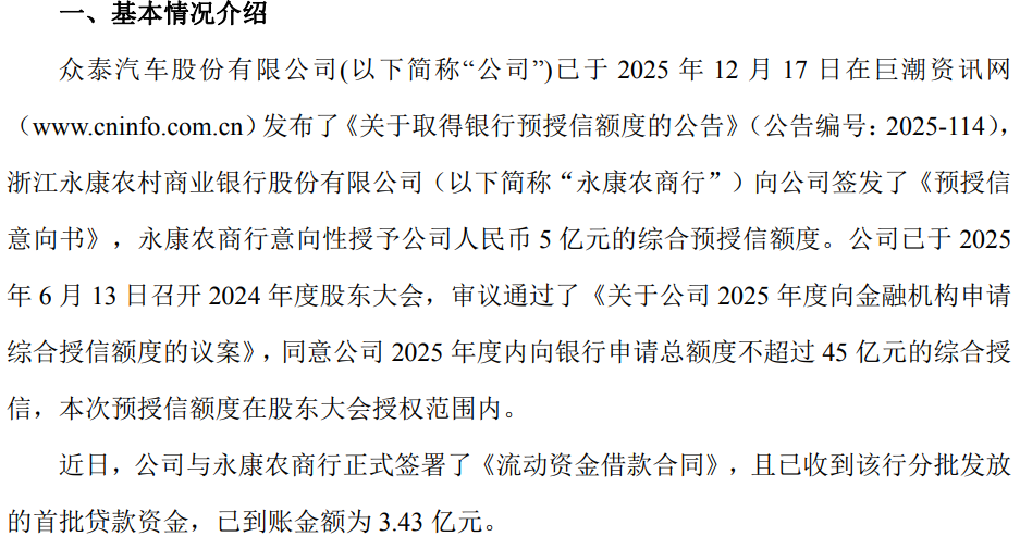 1月23日,众泰汽车股份有限公司(股票代码:000980)发布《关于取得银行贷款并部分到账的公告》,宣布与浙江永康农村商业银行股份有限公司正式签署《流动资金借款合同》,首批3.43亿元贷款资金已分批到账。